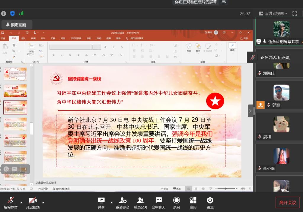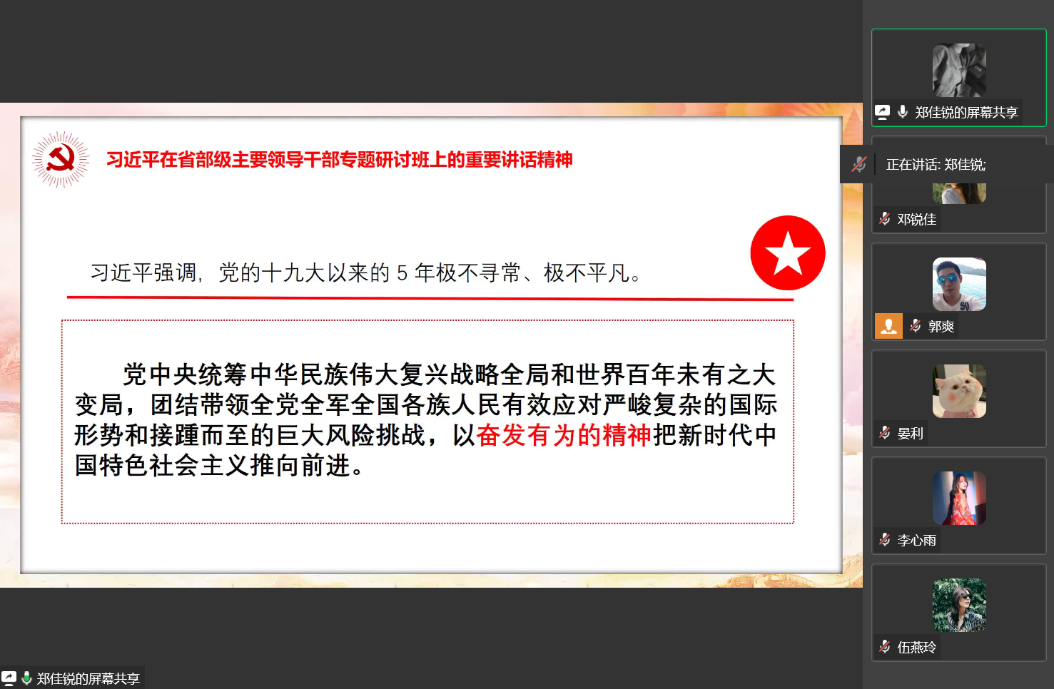 当前位置: 首页 >> 党建双创 >> 主题党日活动 >> 正文 伟德国际bevictor1946员工第一党支部召开8月份主题党日活动 时间:2022年08月19日 16:40 来源:伟德国际bevictor1946 郭爽 2022年8月19日,伟德国际bevictor1946员工第一党支部在线上企业微信召开月8主题党日活动,本次活动应到23人,实到23人,本次活动由支部书记郭爽主持。 会议伊始,首先是由2020级郑佳锐、罗阳、伍燕玲、邓锐佳四位党员同志领学8月相关学习内容。其中郑佳锐同志领学了关于《习近平在新疆考察时的重要讲话精神》、《习近平向世界青年发展论坛致贺信》、《习近平在省部级主要领导干部专题研讨班上的重要讲话精神》的内容,她指出各国青年要弘扬和平、发展、公平、正义、民主、自由的全人类共同价值,以实际行动推进全球发展倡议,助力落实联合国2030年可持续发展议程,共同谱写世界青年团结合作的时代新篇章。罗阳同志领学了关于《习近平主持中共中央政治局7月28日会议》、《习近平在党外人士座谈会上的重要讲话精神》、《习近平向中国共产党与世界马克思主义政党论坛致贺信》的内容,她指出只要贯彻落实好中共中央决策部署,准确识变、科学应变、主动求变,就一定能够抓住历史机遇、赢得发展先机。伍燕玲同志领学了关于《习近平在中央统战工作会议上的重要讲话精神》、《习近平总书记重要文章《把中国文明历史研究引向深入, 增强历史自觉坚定文化自信》》、《习近平总书记重要文章《在庆祝中国人民解放军建军90周年大会上的讲话》》的内容,她指出我们要坚持以新时代中国特色社会主义思想为指导,坚持中国共产党领导,坚持中国特色社会主义道路,高举爱国主义、社会主义伟大旗帜,坚持一致性和多样性统一。邓锐佳同志领学了关于《《习近平生态文明思想学习纲要》出版发行》、《中共中央办公厅转发《中央宣传部、中央组织部关于认真组织学习〈习近平谈治国理政〉第四卷的通知》》、《市委常委会7月19日会议精神(部署学习宣传贯彻《习近平谈治国理政》第四卷等工作)》、《《习近平谈治国理政》第一卷至第三卷(电子版)》的内容,她指出我们深切缅怀为中国人民解放事业和社会主义建设事业而英勇献身的人民军队革命烈士们,他们的牺牲奉献,永远铭记在中国人民心中。领学完毕后,与会党员同志展开了讨论。杨若欣同志说:“作为新时代新青年,应做到全面系统学、及时跟进学、深入思考学、联系实际学,坚持不懈用习近平新时代中国特色社会主义思想武装头脑、指导实践、推动工作,自觉做习近平生态文明思想的坚定信仰者和忠实践行者。”李心雨同志说:“青年代表希望,青年创造明天。中国始终把青年看作推动社会发展的有生力量,我们也要不负祖国的期望,为祖国的建设添砖加瓦。” 讨论后,支部书记郭爽同志作了总结讲话。他提醒党员同志们要加强疫情防范意识,做好防护工作。开学在即,希望各位党员同志能够做好表率,同时积极引导班级其他同学,有序返校。同时,他对党员同志提出殷切希望,希望各位党员同志能够把握住机会,针对自己的实际情况,做出切实的人生规划并为之努力奋斗。 上一条:伟德国际bevictor1946员工第一党支部召开2022年9月主题党日活动 下一条:伟德国际bevictor1946员工第一党支部召开2022年7月主题党日活动 【关闭】