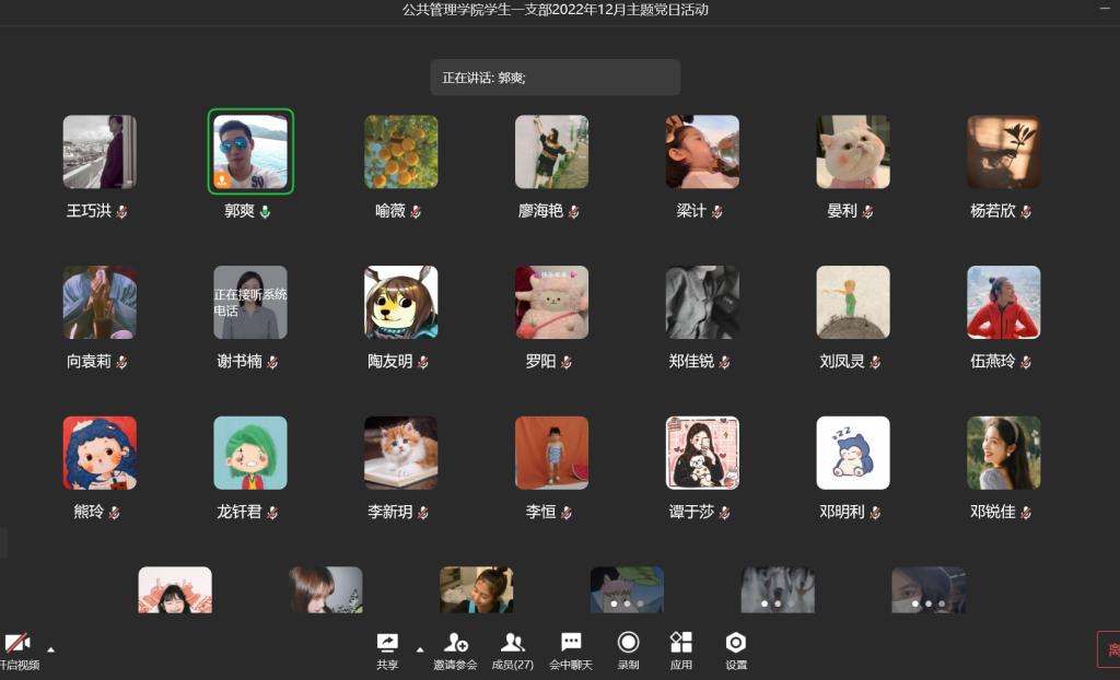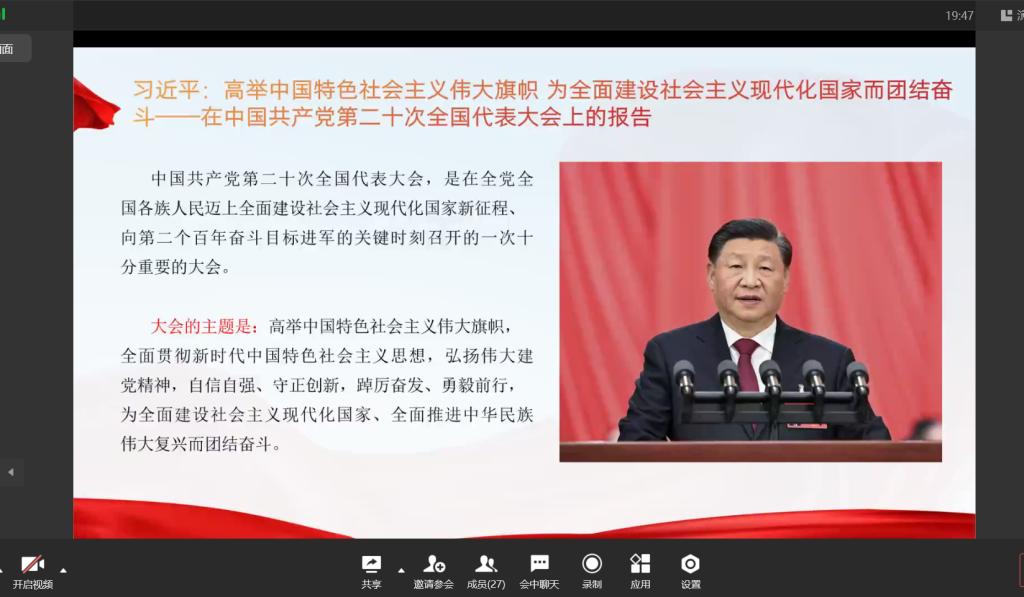 当前位置: 首页 >> 党建双创 >> 主题党日活动 >> 正文 伟德国际bevictor1946员工第一党支部召开2022年12月主题党日活动 时间:2022年12月26日 17:23 来源:伟德国际bevictor1946 郭爽 2022年12月26日,伟德国际bevictor1946员工第一党支部在企业微信召开2022年12月主题党日活动,本次活动应到27人,实到27人,本次会议由支部书记郭爽同志主持。 会议伊始,首先是由2020级梁计、廖海艳、孙孝霞三位党员同志领学12月相关学习内容。其中,梁计同志领学了《习近平:高举中国特色社会主义伟大旗帜 为全面建设社会主义现代化国家而团结奋斗——在中国共产党第二十次全国代表大会上的报告》、《中国共产党第二十次全国代表大会关于十九届中央委员会报告的决议》、《中国共产党章程(中国共产党第二十次全国代表大会部分修改,2022 年 10 月 22 日通过)》、《中国共产党第二十次全国代表大会关于《中国共产党章程(修正案)》的决议》的内容,廖海艳同志领学了《十九届中央纪律检查委员会向中国共产党第二十次全国 代表大会的工作报告》、《中国共产党第二十次全国代表大会关于十九届中央纪律 检查委员会工作报告的决议》、《习近平在第五届中国国际进口博览会开幕式上的致辞》、《习近平在《湿地公约》第十四届缔约方大会开幕式上的致辞》的内容,孙孝霞同志领学了《中共中央政治局常务委员会 11 月 10 日会议精神》、《习近平在二十国集团领导人第十七次峰会第一阶段会议上的讲话》、《习近平在党的十九届七中全会第二次全体会议上的讲话》的内容。领学完毕后,与会党员同志展开了讨论。晏利同志说我们要坚持以习近平同志为核心的党中央的领导,高举中国特色社会主义伟大旗帜,弘扬伟大建党精神,增强“四个意识”坚定“四个自信”做到“两个维护”。熊玲同志说我们的党员、干部,不论在职还是从工作岗位上退下来了,无论在什么时候、什么地方、什么场合,都要始终牢记自己是一名共产党员,都要始终发挥先锋模范作用,都要始终坚持和维护党的领导、维护党的团结统一。 讨论后,支部书记郭爽同志作了讲话。首先,他向在座的党员同志讲述了江泽民同志伟大光辉的一生,我们缅怀江泽民同志,就是要牢记他的殷切希望,要在以习近平同志为核心的党中央坚强领导下,踔厉奋发、勇毅前行,以更辉煌的业绩告慰江泽民同志。其次,他也提醒大四的党员同志要利用好寒假时间努力寻找工作,并且着手毕业论文的事情,在不断学习中提升自己。 上一条:伟德国际bevictor1946员工第一党支开展2023年1月份主题党日活动 下一条:【学习党的二十大精神】“学习党的二十大精神,立志做新时代好青年”知识竞赛圆满结束 【关闭】
