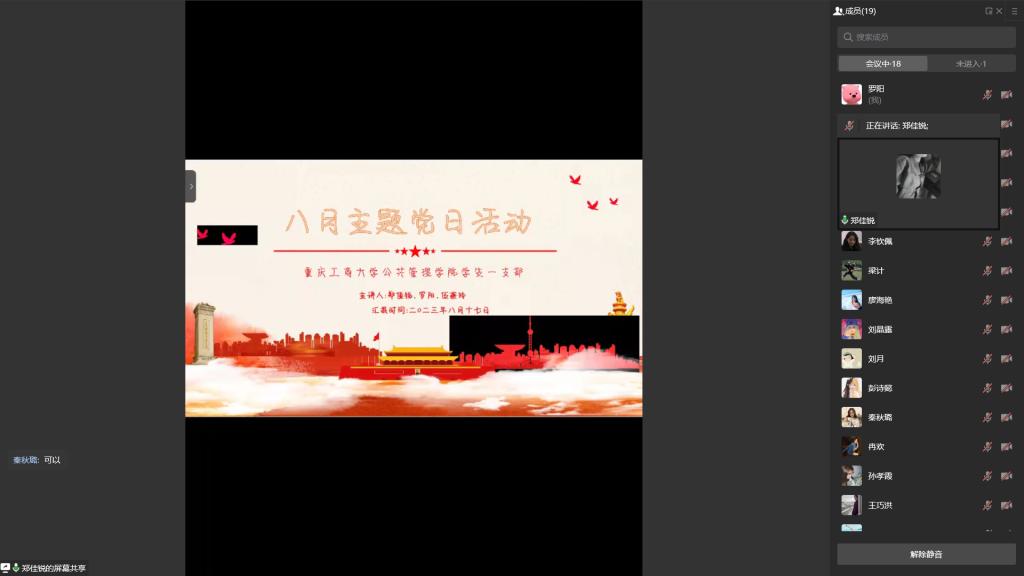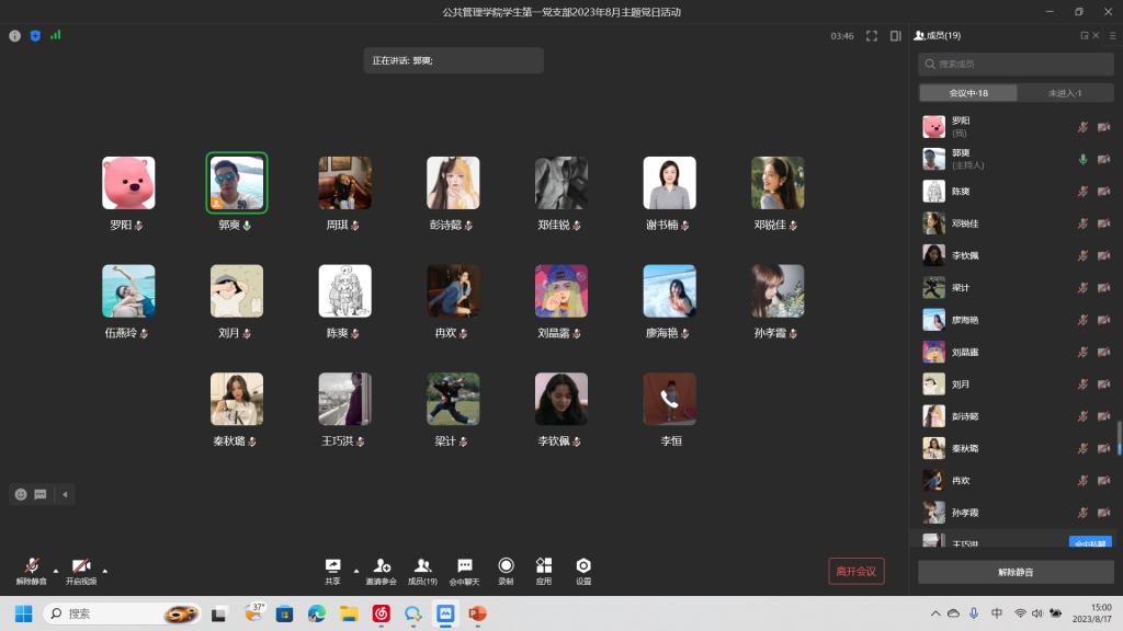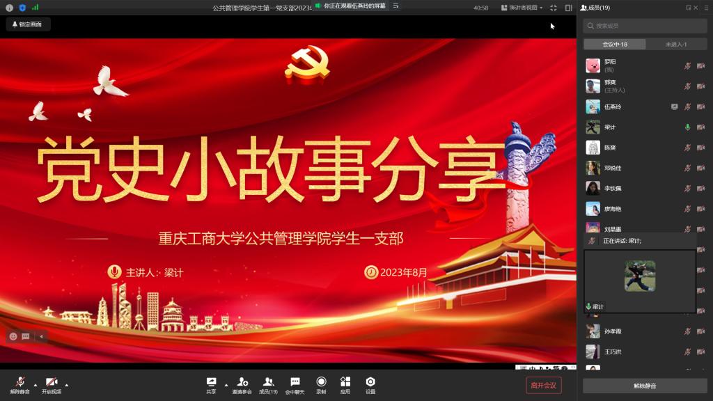 当前位置: 首页 >> 党建双创 >> 主题党日活动 >> 正文 伟德国际bevictor1946员工第一党支部召开2023年8月主题党日活动 时间:2023年08月17日 18:49 来源:伟德国际bevictor1946 2023年8月17日,伟德国际bevictor1946员工第一党支部在企业微信以集中学习的方式开展了线上主题党日活动。本次活动由支部书记郭爽同志主持。 会议伊始,首先是由郑佳锐、罗阳、伍燕玲三位同志领学了《习近平总书记关于党的建设的重要思想》《习近平在上海合作组织成员国元首理事会第二十三次会议上的讲话(全文)》《习近平近日对防汛救灾工作作出的重要指示精神》《习近平在江苏考察时的重要讲话精神》《习近平向全球共享发展行动论坛首届高级别会议致贺信》等学习内容。而后,梁计同志分享了共和国元帅贺龙曲折的入党经历和革命女战士郭纲琳被捕之时一心向党、不屈不挠的故事,与会同志感慨万千,不禁重忆入党初心,更加坚定了理想信念。 最后,支部书记郭爽同志做了总结讲话。他指出,各位同志暑期在坚持学习理论知识的同时,也应当时刻关注国家时事和社会热点,并从中有所感悟和收获。另外,开学将至,希望各位同志积极落实新学期发展新同志的相关工作,为壮大支部队伍贡献力量。 上一条:伟德国际bevictor1946员工第一党支部召开2022级积极分子集中谈心谈话座谈会 下一条:伟德国际bevictor1946员工第一党支部召开2023年7月主题党日活动 【关闭】