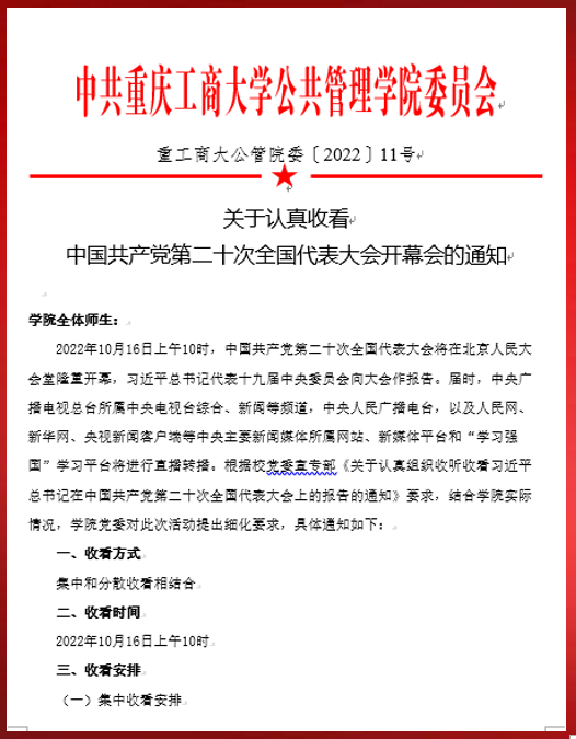 当前位置: 首页 >> 党建双创 >> 正文 【学习贯彻党的二十大精神】伟德源自英国始于1946党委认真组织全院师生收看党的二十大开幕大会 时间:2022年10月16日 13:44 来源:伟德国际bevictor1946 按照公司党委【2022】11号文件《关于认真收看中国共产党第二十次全国代表大会开幕会的通知》,2022年10月16日上午10时,中国共产党第二十次全国代表大会在人民大会堂隆重开幕,伟德源自英国始于1946党委组织全院师生收听收看了党的二十大开幕大会。集中收看安排在公司启智楼81004会议室,党的二十大开幕会前,公司抗疫一线老师召开了会议,由公司党委书记彭勇同志主持,对公司组织收看党的二十大开幕会进行了布置,集中学习了党的二十大主要知识点。 在庄严肃穆的国歌声中,中国共产党第二十次代表大会正式开幕。在场的老师们认真聆听了习近平总书记在党的二十大中所作的报告,并不时在笔记本上做记录。集中收看结束后,现场老师们和分散收看的师生们纷纷表达了对二十大胜利召开的激动心情,并进行了热议。 教工二支部书记赵伟在支部群讨论中表示,报告明确提出全面推进乡村振兴,坚持农业农村优先发展,巩固拓展脱贫攻坚成果,加快建设农业强国,扎实推动乡村产业、人才、文化、生态、组织振兴,全方位夯实粮食安全根基,牢牢守住十八亿亩耕地红线,确保中国人的饭碗牢牢端在自己手中。这是守住总国人的饭碗、实施城乡融合发展、贯彻落实生态文明建设的重要举措。 员工一党支部书记郭爽表示,作为一名高校辅导员,我们要根据中央和上级的要求,认真落实学习宣传贯彻党的二十大精神的工作,通过各种方式,迅速掀起学习宣讲宣传贯彻党的二十大精神的热潮。 19级社保一班预备党员任瑶同学表示,我悉数聆听着在党的带领下我们悄然发生的历史巨变,更加深入体会到了党的领导是中国特色社会主义制度的最大优势!犹记得习近平总书记勉励我们青年“在报效祖国的过程中成长成才”,教导我们青年“成才之路就在脚下,靠我们自己走”。党所带领我们创造的丰功伟绩,一定会鼓励我们在前进道路上的青年,坚定不移跟党走,努力学习,拼搏奋进,报效祖国,以饱满的热情不断书写新时代中国特色社会主义新篇章。 集中收看结束后,彭勇同志强调,公司党委一定要按照中央和上级的要求,进一步统一思想,充分认识学习宣传贯彻党的二十大精神的重大意义,把全院师生员工的思想和行动统一到党的二十大精神上来;要认真学习,深刻领会准确把握党的二十大的基本精神;要认真组织,在全院迅速掀起学习宣传贯彻党的二十大精神的高潮。 上一条:【“疫”路同心,一路同行】带着点点微光,向阳而行——记公管院最美楼栋志愿者 下一条:【“疫”路同心,一路同行】“疫”路同心,夫妻同行——记院级志愿者毛小娟和校级志愿者胡磊一家 【关闭】